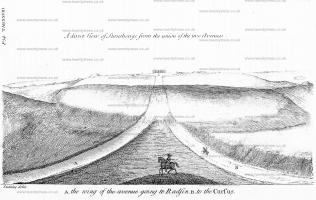 Stonehenge by William Stukeley. This Radfin-farm [Map] seems to retain its Celtic name: meaning a ford or passage for chariots, the old way of carriage here used. Rhedeg currere, rhedegfain curfitare, in Irijh reathaini. Fin in the old Irish, is white. It regards the chalky road which went up from the ford. 'Tis a pretty place, seated in a flexure of the river, which from hence seems to bend its arms both ways, to embrace the beginning of the avenue. The place is very warm, sheltered from all winds, and especially from the north. I am persuaded it was originally a seat of an Archdruid or Druid. See Mr. Poland discoursing of the Druids houses, p. III. The nuns of Ambresbury too had a chapel there. The ford is now quite disused, because of the bridge by the town's end; and the road of it is foreclosed by hedgerows of pastures on both sides the lane, leading northwards from Ambresbury to north Wiltshire. This road lying between Radfin and the beginning of Stonehenge avenue, is sweetly adorned with viorna. We are supposed now to stand on the tumulus of Hara, an old Irish royal name, and possibly the king who was coadjutor in founding Stonehenge, who lived, it's likely, in the eastern part of Wiltshire: for which reason they directed the avenue this way.