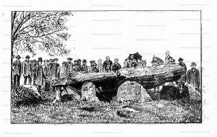 He had not been able to find any historical references to King Arthur's Stone, while the legends were few and imperfect, yielding no distinct ground even for plausible conjecture as to the person to whom or the time when that structure was reared. The name was rather patriotism than history. There is no reason for supposing that King Arthur ever ruled in this district. It is true that the existence of Arthur had been disputed, but the doubt seemed to the speaker an unreasonable one. There was certainly a real King Arthur who ruled the district now known as Somerset, Devon, and Cornwall, and whose body was found buried at Avallonia in the reign of Henry II., but there is no reason for connecting him with this cromlech unless we take the name as a patriotic myth. As the great national hero, Arthur was to the Briton the symbol of the glorious past of their independence, and everything remarkable or interesting seemed to be consecrated by bearing the name of Arthur. Thus we have mountains, cromlechs, stones, and other objects in distant places where Arthur never ruled, as well as in his own little kingdom, named from the hero-king. Of course where nothing certain was known there was a fine field for conjecture (a laugh). The archaeologists had "ample room and verge enough" for theory. There were indeed some facts, very massive and imposing and undeniable; there was the huge table of stone, the crom-lech, or covering stone, its firmly fixed supports, the remains of a small inner circle, and the large outer circle covered with earth and greensward, and fragrant with purple thyme and other wild flowers, upon which the audience were seated. These were the facts, and all he could do was but to endeavour to explain them from other monuments of the kind which he had visited. The ground plan, for example, seemed to be a miniature of that of Stonehenge, which, however, had no central cromlech. He thought it was probable that the circle had been double, a passage being thus left all round, although only one of the inner ring of stones was left standing. The circular form was to his mind conclusive evidence of British work. The Briton's mind seems to have been full of the circle: the circle of the heavens, the circle of the sun, the circle of the moon, the circle of the seasons, seem to have suggested the idea, which the Briton carried out in his camps, his dwellings, his temples, his burial places. Just as the Roman founded all his works on the right line and always used the square or the oblong, a square and a half. In this case, he thought the cromlech was built first. Some great Silurian chief was brought thither with rude pomp and ceremony; his body was placed on the ground, covered perhaps with a little earth; the body of his favourite horse was laid at his feet, and his weapons by his side, and the huge Lech or covering stone was brought up an inclined plane upon rollers, and so placed by the strong arms of a nation as a memorial of their lost chief to future ages. All this would be done, as the old British phrase has it, "in the face of the sun and in the eye of light," and amid a band of white-robed Druids and bards, while the armed throng formed a reverent circle around. Then, too, at night, if we might follow some interpreters of the bards, the hollow place beneath the cromlech might be used in the initiation of neophytes. Lonely watching in the house of death has always been supposed to confer wisdom, and especially prescience, upon the watcher, who regarded it as the house of life to his spirit. Here he communed with the invisible world, and from hence he issued after his vigils (like the knight of mediaeval times) pledged to a new life. Perhaps he ought to apologise for detaining the audience so long with these theories and conjectures, but he had told them that he had little of information to give them; and they would all agree with him that when one has really little to say it sometimes takes a great many words to say it (applause).