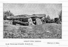 This monument is under the protection of the Ancient Monuments Department of the Office of Works; the key is kept at Caeperthy Farm, 500 yards E.S.E. of the monument. It is clearly the remains of a chambered Long Barrow, the mound being still visible around the burial chamber and still distinguishable to the N.W., where it is crossed by the lane known as Arthur's Stone Lane. The northern hedge of this lane forms here the boundary between the parishes of Dorstone and Bredwardine. The remains consist of a large burial-chamber and capstone still covering it, with a short approaching "passage" of two upright slabs on the N.W. At right angles to this passage, to the N.W. of it and on the S.W. side of the mound, is another passage formed of two uprights on each side, the space between each of the uprights being filled with smaller stones of which vestiges remain. The capstone itself is very large, about 1 5 feet by 9 feet across the middle where it is broken across. It has also split horizontally and a large "flake" has become detached; this is due to the original "false-bedded" stratification of the sandstone of which it is formed. The capstone covers a chamber of polygonal shape formed by the uprights still in position (including one fallen). The plan of the chamber resembles that at Gwernvale (Brecknockshire), Hengwm (Merionethshire), and some of the Gloucestershire examples, but at Gwernvale the capstone is now gone. There is now a space of 2 feet or more between the uprights, filled originally, no doubt, by smaller stones built in, as in the S.W. passage. The orientation of the mound is from slightly W. of N. to E. of S., the chamber being at the southern end. At the south end, 10 feet south of the south end of the capstone, is an isolated upright slab (long axis East-West) with a fallen (?) stone lying at its side in contact with it. Possibly this may be the remains of the surrounding wall of uprights, of which there are no other traces; it is difficult otherwise to explain its purpose. At about 2 feet from the ground on the northern face of this stone, is a horizontal row of about a dozen "cup-markings," the size of a large finger-dint; no opinion is hazarded as to their age or origin. Higher up on the same face are names cut by visitors in 1912 and at earlier dates. The view from the spot is magnificent, especially southwards towards Abergavenny and across to the Black Mountains. Visited August 15th, 1921.