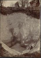 Avebury Henge Ditch. Avebury 22nd April 1922. "General view of sides, end and bottom of the Fosse (ditch), Cutting IX, looking North West. The levelling rod, 10 foot high. Vertical depth of fosse from upper margin, 30 foot. It is seen that the bottom of the fosse rises considerably from west to east. On the top the two standing stones from the entrance to the great enclosure from the causeway."