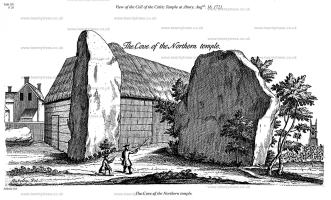Avebury by William Stukeley. The centers of these two double circles are 300 cubits asunder. Their circumferences or outward circles are 50 cubits asunder, in the nearest part. By which means they least embarrass each other, and leave the freest space about 'em, within the great circular portico (as we may call it) inclosing the whole; which we described in the former chapter. There is no other difference between these two temples (properly) which I could discover, save that one, the southermost, has a central obelisc, which was the kibla, whereto they turned their faces, in the religious offices there performed: the other has that immense work in the center, which the old Britons call a cove [Map]: consisting of three stones placed with an obtuse angle toward each other, and as it were, upon an ark of a circle, like the great half-round at the east end of some old cathedrals: or like the upper end of the cell at Stonehenge [Map]; being of the same use and intent, the adytum of this temple. This I have often times admired and been astonished at its extravagant magnitude and majesty. It stands in the yard belonging to the inn. King Charles II. in his progress this way, rode into the yard, on purpose to view it.