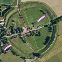 Taking the Centre of the Henge as where the lines between the entrances cross then a line drawn from the Centre to the extant stone [Map] in the north-east quadant is aligned to the Midwinter Sunset and Midsummer Sunrise - the magenta line on the Schematic.