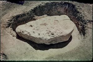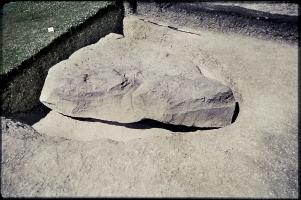 1938-39. Alexander Keiller's Slides. General view of the excavation of Stone 4 [Map] in the south west sector of the henge at Avebury showig the inner face.