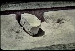 1938-39. Alexander Keiller's Slides. General view of the excavation of Stone 10 [Map] in the south west sector of the henge at Avebury showing its inner face.