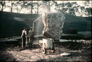 1938-39. General view of two man using a water spray to clean Stone 16 [Map] in the south west sector of the henge at Avebury, showing the inner face.