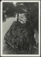 Caption on reverse of the photo: "1909. Two of the great sarsen standing stones [Avebury Outer Circle Stone 46 aka Swindon Stone [Map]] of the outer circle situated at the north of the circle a few feet to the west of the road leading out of Avebury to Swindon. Looking east-north-east, the vallum [bank] being seen beyond the trees”. The person in the photo is Harold St George Gray.