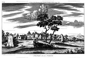 Avebury by William Stukeley. Table XIII. A View of the Remains of the Northern Temple at Abury. Aug. 1722. A. Abury Steeple. B. the cove [Map]. C. Windmill hill.