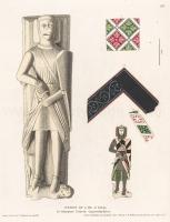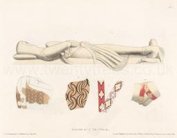 Effigy of A De L'Isle. THERE were two families in England of this denomination; one deriving their appellative from the Isle of Wight [Map], the other from the Isle of Ely [Map]. Of the last was the subject of this effigy. The De Lisles possessed the manor of Rampton, in Cambridgeshire, from the reign of Henry the Third to that of the third Edward. They had from Edward the First a grant for a weekly market, and an annual fair in their manor of Rampton. A moated site, and some considerable ruins, near the church of that place, point out their residence. The effigy delineated is in the church. The mails on the hauberk of this figure appear to be effaced, and the mouth is sadly distorted by the carving of some idler. On the surcoat and shield is the coat of De Lisle, Or, a pale and two chevrons Sable, cotised Gules. The feet rest on a lion. Details. Plate 1. 1. Ornaments of the pillow. 2. Scroll-work on the chevron. 3. Pattern on the belt. 4. The figure as originally painted. Plate II. 1. Hood of the hauberk. 2. Rings of the mail. 3. Patterns on the waist-belt and appendages. 4. Heel of the spur, and straps.