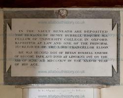 in the vault beneath are deposited the remains of Henry Burrell esquire M.A. Fellow of University College in Oxford, Barrister at law and one of the principal secretaries of the Lord Chancellor Eldon. He was second son of Brian Burrell Esquire of Broome Park, and died at Lincoln's Inn on the xiii of june a.d. mdcccxiv in the xxxviii year of his age.
