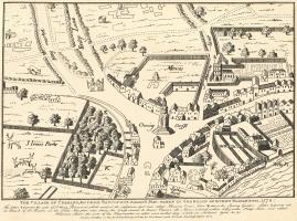 John Evelyn's Diary. 31st August 1654. From Cambridge, we went to Audley-End [Map], and spent some time in seeing that goodly place built by Howard, Earl of Suffolk, once Lord Treasurer. It is a mixed fabric, between antique and modern, but observable for its being completely finished, and without comparison is one of the stateliest palaces in the kingdom. It consists of two courts, the first very large, winged with cloisters. The front had a double entrance; the hall is fair, but somewhat too small for so august a pile. The kitchen is very large, as are the cellars, arched with stone, very neat and well disposed; these offices are joined by a wing out of the way very handsomely. The gallery is the most cheerful and I think one of the best in England; a fair dining-room, and the rest of the lodgings answerable, with a pretty chapel. The gardens are not in order, though well inclosed. It has also a bowling-alley, a noble well-walled, wooded and watered park, full of fine collines and ponds: the river glides before the palace, to which is an avenue of lime trees, but all this is much diminished by its being placed in an obscure bottom. For the rest, is a perfectly uniform structure, and shows without like a diadem, by the decorations of the cupolas and other ornaments on the pavilions; instead of rails and balusters, there is a border of capital letters, as was lately also on Suffolk House, Suffolk Street, near Charing-Cross, built by the same Lord Treasurer.