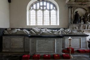 After 1667 recumbent effigies of Richard Shireburn (age 76), his son Richard Shireburn (age 41) and his wife Isabel Ingleby (age 40) and at Church of All Hallows, Great Mitton [Map].