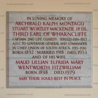 After 1979. Church of St Leonard, Wortley [Map]. Memorial to Archibald Montagu Stuart-Wortley-Mackenzie 3rd Earl of Wharncliffe and Maud Lillian Elfreda Mary Wentworth-Fitzwilliam (deceased).
