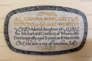 After 8th March 1981. Church of St Leonard, Wortley [Map]. Memorial to Joanna Montagu-Stuart-Wortley (deceased).