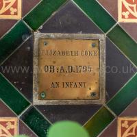 After 1795. Floor marker in the Chancel of the Church of St Mary Magdalene, Eardisley [Map] to Elizabeth Coke died 1795. Probably a daughter of Francis Coke (age 31) and Anne Whitcombe (age 27).