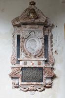 After 25th July 1666. Church of St Michael and All Angels, Edenham [Map]. Monument to Montagu Bertie 2nd Earl Lindsey (deceased). Two adjacent memorial tablets have moulded base and cornice and are surmounted by the Cartouche of arms and the Ancaster cannon. To the sides are military trophies in high relief and at the base, arms, anchors and helms.[Source: BLB].