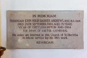 After 29th September 1984. Memorial to Predendary John Hugh Barker Andrews at the Church of the Holy Trinity, Weare Giffard [Map].