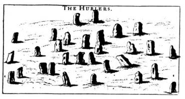 The Antiquities of Cornwall by William Borlase Chapter VII. Of this kind is the Monument call'd the Hurlers [Map], in the Parish St. Clere, Cornwall, the Stones of which, by the vulgar, are suppos'd to have been once Men, and thus transform'd, as a punishment for their hurling upon the Lord's Day.1 This Monument consisted of three Circles from which many Stones are now carry'd off; what remain, and their distances may be seen (Plate XV. fig. vi.).