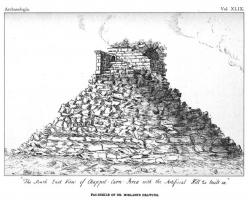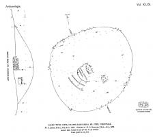 Archaeologia Volume 49 1885 Section 3. The last tumulus I propose to notice is that which crowns the summit of the last hill in England - Chapel Karn Brea [Map]. The estate on which it stands derives its name from a chapel which once stood on the top of this very cairn. The accompanying drawing, made by my ancestor Dr. Borlase, which has never yet been correctly engraved, represents the mound and chapel as they appeared one hundred and fifty years ago. In 1816 the stones of the little building were removed in order to make additions to a barn, and all that now remains is the rude pile used by the fishermen as a landmark and called the "tummal." Satisfied that such an accumulation of stones-for it is fifteen feet high and sixty-two feet in diameter — would never have been gathered together by the chapel-builders, I several years ago sunk a pit to the centre, which, however never reached the level of the natural soil. Not contented with so poor a trial, in the autumn of 1879 I caused a trench thirty feet wide to be driven towards the the south-east, at a distance of six feet six inches from the entrance of the chamber, and at a higher level, stood a fine cist or dolmen, covered by a single well-chosen slab, five feet square on the top and one foot six inches thick. The cist itself measured internally three feet by two feet six inches, and two feet in depth. There was nothing in it, and the floor was composed of the loose materials of the earlier mound on which it had been built. From the evidence of an old farm labourer who had known the place for years, I am inclined to believe that there was another similar cist removed from the west-south-west side. In the débris of the cairn above this some pieces of Romano-British pottery were found, and among them a small fragment of Samian ware. A buttress sunk to support the corner-stone of the chapel had reached to within a foot or two of the cover of the cist; but it was plain that the builders of the chapel had never disturbed either that or the chamber, and were therefore ignorant of their existence. Veneration for the spot on the part of the natives probably induced the Christian missionaries to adopt it for themselves, and the fact that an annual tour is made by country-people to a stone on the hill-side below points in the same direction. Reaching the level of the foundation of the chapel, mediæval pottery and glass occurred, as well as some of the very curious ridge-tiles of the edifice. Taken altogether, the evidence derivable from the exploration of this cairn-although the discoveries were next to none — was very instructive. It is clear from it that the period of the chambered mounds or giants ' graves-perfect specimens of which we possess at Pennance and Brane in the same district, and also in Scilly, preceded that of the cist or dolmen proper; and the occurrence of the Samian ware, and other objects at higher levels, afford us, like so many geological strata, evidences of human society in each successive age, even down to the ferret-bell which I found in a rabbit-hole at the top. I may add that this cairn, being on my own property, will be carefully preserved. Occupying as it does a position so important to mariners, I have restored it to its original height, leaving the chamber and cist exposed to view.