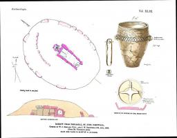 Illustrated London News, October 11th 1879. Sepulchral Remains In Cornwall. Mr. W. C. Borlase (age 31), F.S.A., has recently been making some interesting discoveries in the parish of St. Just-in-Penwith, in Cornwall, one of the most fertile districts for pre-historic antiquities in England. Some of the tumuli have been found to contain very remarkable structural characteristics, such as one dome of dry masonry encasing another, as in the topes of Afghanistan. In one instance, two fine sepulchral chambers were discovered in a mound which had been surmounted by an ancient Christian oratory. The plan and section which our Engraving presents are those of a tumulus at Tregascal [Map], in which the large sepulchral urn shown in the accompanying Illustration was found. The mound was oval, 36 ft. long and 32 ft. broad, with an extreme height of 9 ft. in the centre. It contained a massively constructed chamber, with walls and roof formed of unhewn blocks of granite, 11 ft. 9 in. long, 4 ft. wide, and 3 ft. 2 in. high. It lay in the direction of north-west to south-east ; at the north-west end was a raised platform of stone. The floor of this chamber was strewn with a layer of calcined human bone, among which were ashes, flints, fragments of pottery, and a perforated sandstone implement, perhaps a charm (see fig. 1). At G was taken up the bottom of a small urn of reddish pottery. On the top of the central roofing-stone, at H, was a curious natural excrescence on the face of the granite, a peculiarity which had probably caused the stone to be selected. Outside the north-west wall of the chamber, and resting, mouth downwards, on the surface of a large flat rock, was the urn (see fig. 2), the largest perfect one yet found in Cornwall. It measures 21 in. in height, by 16 in. in diameter at the mouth. The whole of the upper rim is ornamented with a pattern arranged in zigzag form, made by the impression of some instrument, or by that of twisted grass, while the clay was wet. A band of ornamentation, in diamond form, runs round the vessel, on a level with the handles, which are likewise ornamented, and are no less than 5 in. wide. Owing to the roofing stone of the little cist, which had been built up round it, having fallen in, the bottom of the vessel was broken down into it; but this, on being taken out for restoration, was found to be adorned with a cross, champered and raised in bold relief, on the inside. The arms are of equal length, and do not extend to the edge of the vessel, which measures here only 6 in. in diameter. A few other instances of raised crosses on the inside of the bottoms of urns have occurred in Wilts and Dorset. A careful drawing has been made of this one, which is subjoined. The cist which contained the vessel was of very rade construction, and small stones had been set around to wedge it in. The pottery is half an inch thick, and coarsely made. The interior was filled with ashes and minute portions of calcined bone. The mound was surrounded by a ring of upright stones, forming a basement; and there were also traces of an inner wall on the west side. For the plan, section, and drawings we are indebted to Mr. J. W. Trounson, C.E., of Penzance. PHOTOS/PREHISTORY/ViIjmZsp.jpg