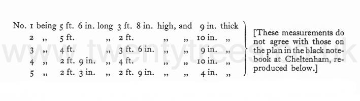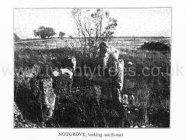 This Long Barrow was dug into in 1821 by Dr. Fry, and again by Dr. Thurnam and Professor E. A. Freeman in 1854. A full account of it is given in Crania Britannica as follows:- The tumulus is about 120 feet in length, 85 feet in greatest breadth, and 10 feet in height, being both higher and broader at the east end than elsewhere. At this end and about 25 feet within the limits of the cairn, is the entrance to a chamber, formed by a large flat stone upwards of 8 feet in length and 4½ feet in depth, which rests on an upright stone on each side, so as to leave an opening of nearly 3 feet in height which was closed by a large flat stone. From this entrance a central gallery extends to the west, about 22 feet in length, 4½ feet in average width, and 5 feet in height. Two pairs of upright stones project at right angles with the interior of this gallery, in such a way as to divide it in three unequal portions. Communicating with the central gallery, on each side, have been two chambers, each about 4I feet in diameter. Those on the north side no longer exist, being in a ruinous condition when first discovered. The sides of this gallery and chambers are formed of large slabs of a rough unhewn oolitic stone, planted on their edges, and with the space between them filled up with dry walling of small stones, the corn-brash of the district, such as forms the body of the cairn. The roof is now formed of other large slabs of stone, laid across and resting on the uprights. When opened in 1821 the roof of the [western] side chamber was found to consist of a 'horizontal arch,' formed by the courses of stone near the top of the walls overhanging each other and gradually contracting the aperture, which was closed in by a single flat stone [capstone] . There is reason to con- jecture that the whole roof, like those of the chambered tumuli at Stoney Littleton [Map] and Nempnett [Fairy Tout] [Map] in Somersetshire [at Gatcombe Lodge, Gloucestershire] and at New Grange [Map] and Dowth in Ireland, had been originally of this character; as there was distinct evidence of the whole having been more or less disturbed at a very early period, and the chambers entered from above. The cairn of stones heaped over the chambers had been neatly finished round its outer border with a dry walling, carried to the height of from 2 to 3 feet, which communicated by an internal sweep, with similar walling extending from the entrance to the chambers. At the west end, these walls are intersected by others at right angles. ... the object of which it is difiicult to understand .... [Similar walling was observed in the chambered cairn at St. Nicholas, Glamorgan, by Mr. John Ward, F.S.A. Arch. Camb., 6. S. XV., 253-320; XVI., 1916, 239-294].