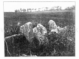 "The excavators had opened a trench about 100 feet in length, in a direction due east and west by compass. The western extremity was the broadest, the mound gradually diminishing in width to the opposite end. The workmen had struck upon the entrance, which, when exposed, showed a chamber formed of five large, unhewn stones, two on each side, and one placed transversely, the dimensions of which were 4 feet in width by 8 feet 6 inches in length. There was no covering stone, but the entrance was flanked on either side by a wall of dry masonry, very neatly fitted, forming a segment of a circle, which, if completed, would have enclosed a well-like chamber in front of the entrance to the tumulus. This wall had been abruptly broken off; but there were amongst those present some who thought they detected signs of its having been at one time continuous. It was evident that the whole structure had been thoroughly ransacked and broken up by former explorers; and so completely had the work of devastation been accomplished that hardly one stone was left upon another. The chambers, with the one exception already noted, had been entirely demolished, and but a few bones scattered throughout the tumulus remained, all more or less in a fragmentary condition. These fragments comprised one fully developed frontal bone, male; portions of two male lower jaws, and portions of two female skulls; several thigh bones, and bones of the leg and foot, including the remains of children, but all much broken. There were found the remains of six individuals at the least, viz., two men, two women and two children, the latter between six and eight years of age. There w'ere several bones of cattle and calves; teeth of horse and ox; a portion of the bones of the foreleg of a dog; several boars' teeth, tusks and grinders, and parts of jaw bones; a bone 'scoop,' formed of a shank bone of a horse; and a large quantity of a black, unctuous substance, having the appearance of w'ood or animal charcoal; but no burnt bones. A small portion of a flint flake was detected in the black paste. Besides the organic remains above enumerated, some pieces of rude pottery" were found, which, with a Roman brass coin of the Emperor Germanicus, complete the list of objects yielded by the exploration of this large sepulchral mound, w"hich, in consequence of the violence it had undergone at the hands of former explorers, afforded but little to compensate the Club for the trouble and expense of opening it." Visited December 1st, 1920.