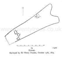 Finds Near Stow on the Wold. Upper Swell Barrows. — [Pole's Wood East Barrow [Map] or Pole's Wood West Barrow [Map]] Had the programme been adhered to, the road from Upper to Nether Swell would have taken our party under the two horned barrows, described in "British Barrows," which, it was hoped, the Society would have inspected. A detail or two of "finds," subsequent, and too late for insertion in the above work, may be worth recording, viz: secondary Saxon interment, on that favourite spot, the horned end of Long Barrows. Two Saxons were interred, after their wont, in pure earth, on a barrow of sheer stones. No 1, a young man, arms bent; left, on breast; right, on stomach — clavicle, scapula, tibia, fibula wanting; only half of right femur; under right pelvis, a small iron knife; spear on right side. The bones were "mashed" by heavy stones over them. No. 2, spear-head, like that of No. 1, only horizontal over head; left arm down by side; a large knife below. This skeleton more perfect, was that of a strong tall man; yet tibia, fibula, feet and finger bones were not found with the body; but bones that might have belonged to it were found on the top of the barrow, lower down. The bones of both were, in part, decayed and weatherworn. Both lay on their backs in line with the harrow, a foot to 18 inches below the surface and 17 ft. from the curve in the horns.