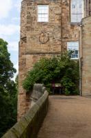 Tower on the riverside of the South Bailey, Durham with covered alley into the College.