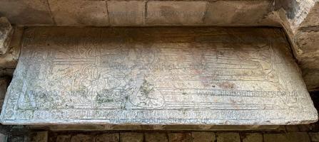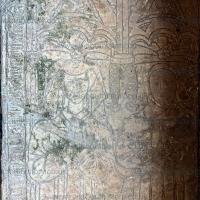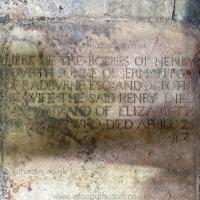 On 4th August 1432 Peter Pole (age 50) died. He was buried at St Andrew's Church, Radbourne [Map]. Grave slab of him and his wife Elizabeth Laughton (age 48) exceptionally well carved. The ermine lining of his long gown and her mantle visible. She has her feet resting on two dogs, both with bells on their collars; His feet are resting on one dog which also has a collar alebit not with bells on that may be seen. Note his belt with the initial 'P' on it, his long, pointed, shoes, his six buttoned cuffs and her reticulated head-dress with its outer edges of the extending upwards into vertical points.