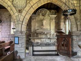 St Andrew's Church, Radbourne [Map]. Alabaster Fluted Period monument in the north aisle. The identification somewhat difficult. Either Ralph Pole (age 62) and his wife Elizabeth Moton, or their son John Pole, who predeceased his father, and his wife Jane Fitzherbert (age 12). He wears a Lancastrian Esses Collar. Hawk Crest. Misericorde. The dogs on which their feet rest unusuall for chewing at her dress - usually these chewing dogs are separate - and for there being two at her feet.