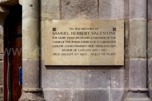 After 6th August 1927. Monument to Samuel Herbert Valentine (deceased) at St Laurence's Church, Ludlow [Map].