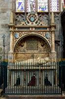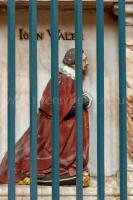 After 1625. Monument to Edmund Walter and his wife Mary Hakluyt at St Laurence's Church, Ludlow [Map]. Their three sons and two daughters are shown kneeling, around the sides of the tomb chest. The figure in red judge's robes is the second son, John (age 59), who became a Chief Baron of the Exchequer in 1625, the same year that his older brother James died. The tomb was erected after 1625 as James's (deceased) will mentions his intention "…to have erected over my father some fitting remembrance or monument within the church where they lie buried … if the same be not performed in my lifetime the charge whereof I Ieave to my brother John". The original railings include corner standards with the initials EW and MW on the iron pennants. Possibly a work of Cornelius Cure.