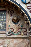 1580. St Laurence's Church, Ludlow [Map]. Monument to Ambrosia Sidney. Her father's (age 51) arms top middle as follows: Sidney, Clunford, Barrington, Mercy, Mandeville Arms differenced with an escarbuncle, Chetwyn, Belhouse (the lions should be shown between three black cross-croslets), and