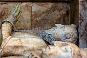 After 19th March 1612. Stuart Hooded Monument monument with a figure leaning on their elbow to Mary Dawnay Baroness Eure (deceased) at St Laurence's Church, Ludlow [Map]. The monument is now in the south transept but was originally in a more prestigious position at the east end of the chancel, on the south side, opposite the Townshend tomb. It was moved when the chancel was restored by Scott in 1859-60. The figure of Lady Eure was originally painted: traces of black paint can still be seen in the folds of her elaborate dress. The inscription ... Here lyeth expecting a joyful resurrection the body of Dame Mary Eure late wife to the Right Ho Ralph Lord Eure (age 53) Baron of Malton, Lord President of the Principality and Marches of Wales and Leiutenant of the same and daughter of Sir John Dawney of Sessey in the County of York she departed this life the 19th day of March 1612 at the age of 55.