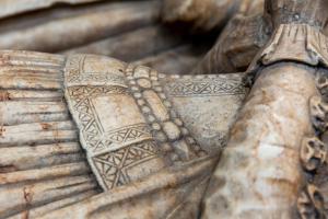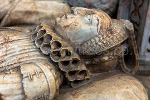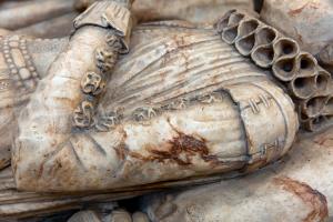 After 5th February 1638 John Bridgeman (deceased) was buried at St Laurence's Church, Ludlow [Map]. The monument is most convincingly attributed to the workshop of the tomb maker Samuel Baldwin of Bristol although some source suggest Francesco Fanelli (age 48); the carving reflects the Italian-influenced innovations of London tombmakers: the figures have naturalistic features and there are skilfully carved drapery and garlands. The monument was commissioned by his wife Frances Daunt (age 60); Bridgeman's will entrusted her to create a monument as she thought fit.