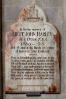 Lieutenant John Harley: On 2nd January 1880 he was born to John Harley of Beedlings, Pulborough at 39 Brook Street, Grosvenor Square. He was educated at Charterhouse where he was awarded Master of Arts. He was elected to the Society of Antiquaries of London. In 1914 Lieutenant John Harley joined the Artists' Rifles. He received his commission as Temporary Lieutenant in the 13th Battalion, Worcestershire Regiment, in Feb 1915. On 8th May 1915 he and May Winifred Sheppee were married. Two days later he sailed for Gallipoli. On 4th June 1915 he died during the Battle of Crithia at Kereve Dere, Gallipoli. The Officer Commanding the 1st Batallion, King's Own Scottish Borderers, forming part of the XXIXth Division to which he was attached, wrote "Your son was in command of the platoon in the right company of the first line to advance against the enemy's trenches, and I regret to say that after gallantly leading his men out of the trenches he was not able to live in the very heavy fire that was brought to bear upon the advancing troops. His body was buried, probably near where he fell.