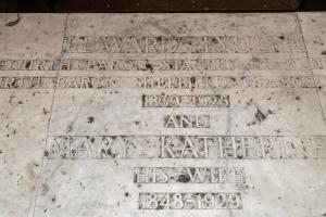 St Mary's Church, Nether Alderley [Map]. The chancel contains memorials to the Lords Stanley of Alderley. The memorial to John Stanley 1st Baron Stanley Alderley contains his effigy dressed in peer's robes lying under a canopy with his hand on a book, dated 1856 and by Richard Westmacott. On the other side of the chancel is a memorial to his son Edward John Stanley 2nd Baron Stanley and 1st Baron Eddisbury, his effigy holding a scroll in his hand and with a dog at his feet. Engraved in brass on the side of the memorial are the figures of his widow and children. Lady Stanley is seated in the middle with their four surviving sons on her right, five surviving daughters on her left and three children who had died at a young age at her knee and on her lap. A memorial tablet to John Constantine Stanley, who died in 1878, is by Joseph Boehm.[12] The chancel contains a monument to Rev. Edward Shipton, rector of the church from 1625 to 1630.