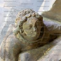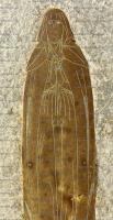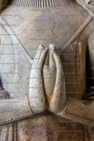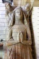 Around 1350. St Mary's Church, Sprotbrough [Map]. Effigy of unknown female in 20th Century Canopy. Appears to be clasping her heart. Note the curious carving at her feet shown reflected in mirror.