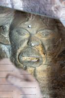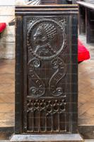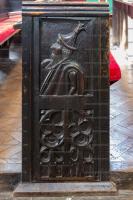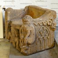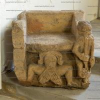 Around 1350 Sanctuary Seat aka The Firth Stool at St Mary's Church, Sprotbrough [Map]. The seat would give sanctuary in the church if one sat on it. The chair has a traceried panel on its left side, which cannot be seen in the image. On the arm is a sculpture of a figure which is quite worn, and underneath the seat is a bearded figure with their head under the seat and resting on their hands, as if pushing the chiar up. The chair is likely to be 14th century, and the church dates back to the 13th and 14th centuries.