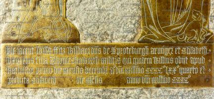 After 1st December 1474. Memorial brass to William Fitzwilliam (deceased) and his wife Elizabeth Chaworth (deceased) at St Mary's Church, Sprotbrough [Map].