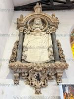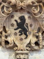 Floor slab at St Mary's Church, Sutton Scarsdale [Map] to an unknown member of the Foljambe family, as identified by 1. Foljambe Arms, 2. the Foljambe Crest of a crooked leg with a spur, and 3. the feet resting on a 'Chatloup' aka 'Calopus' i.e. a monster with a wolf's body. a cat's face and goat's horns. The armour of the fluted period i.e. 1460-1530. In 1490 Godfrey Foljambe (age 17) and Catherine Leeke (age 14) were married - she the daughter of John Leke (age 36) who was Lord of the manor of Sutton Scarsdale Hall, Derbyshire [Map]. The floor slab may be for one of their children who died before reaching adulthood; possibly John Foljambe.