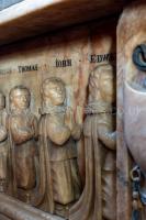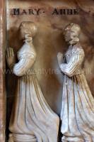 Around 1558. St Michael's Church, Penkridge [Map]. Monument to Edward Littleton (age 53) and his two wives Helen Swynnerton and Isabel Wood. His first wife Helen Swynnerton on his right with the simpler English gabled hood, his second wife on his wife with the later, more complex, French Hood. Armorials of Littleton, Wood and Swynnerton families. Sculpted by Richard and Gabriel Royley of Burton upon Trent.