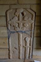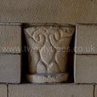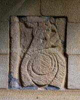 Before 1500. Carvings in the South Porch of St Peter's Church, Edensor [Map] including the armorial of the Leche family who owned Chatsworth before the Cavendish family and whose crest is a snake held in a fist, which may have been the origin of the Cavendish snake crest.