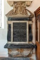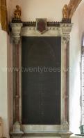 After 1636. St Peter's Church, Shelford [Map]. Monument to Catherine Hastings Countess Chesterfield. Foliate surround to the inscription flanked by single vase pilasters with decorative capitals supporting the segmental pediment containing shield of arms. The apron has a decorative swag.