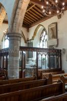 After 1596. St Peter's Church, Shelford [Map]. Helm and gauntlets of Thomas Stanhope (age 56).