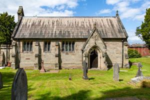 Exterior of St Stephen's Church, Great Heywood [Map] with the Anson graves, Earls of Lichfield, closest to the church.