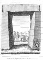 A Sentimental Guide to Stonehenge by Lady Antrobus. As to the kinds of stone actually employed in the building of Stonehenge, the whole of the outer circle and the four stones lying beyond that circle are undoubtedly "Sarsen" (which are the boulder stones left by the ice-sheet of the glacial period on the Wiltshire downs). There are, in the inner circle, four stones which have been called "horn-stone." The remainder are "diabase," commonly called "bluestones," and similar are found in Wales, and in parts of Cumberland and Cornwall, the so-called Altar Stone being a kind of grey sandstone, not sarsen. The large outlying stone, known traditionally as the "Friar's Heel [Map]," from a legend that when the devil was busy erecting Stonehenge he made the observation that no one would ever know how it was done. This was overheard by a friar p. 28lurking near by, and he incautiously replied in the Wiltshire dialect, "That's more than thee can tell," and fled for his life; the devil, catching up an odd stone, flung it after the friar, and hit him on the heel. This stone is also named the "Pointer," because from the middle of the Altar Stone the sun is seen at the summer solstice (21st of June) to rise immediately above it. The Hele Stone is the true name, "Hele" meaning "to hide," from Heol or Haul of Geol or Jul, all names for the sun, which this stone seems to hide. From the Friar's Heel it is about 66 yards to a low circular earthen boundary, enclosing the area within which Stonehenge stands. Just within the entrance to this earthen ring lies a large prostrate stone called the "Slaughter Stone," supposed by some to have been used for the slaughter of victims about to be offered in sacrifice at the altar. The Slaughter Stone (at the end nearest to the Friar's Heel) bears evidence of tool-marks, there being six small round cavities made in it by blows from a flint tool. On the margin of the earthen ring, one 55 yards on the left, the other 95 yards on the right of the entrance, are two small, unhewn stones.