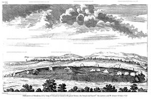 Avebury by William Stukeley. In Monkton, west of the town, is a large and flat long barrow [Map] [Millbarrow Long Barrow [Map]], set round with stones, which I have depicted in plate XXX, 'tis just 120 cubits long, 30 cubits broad in the broadest end. It stands due east and west, the broadest end eastward. Its breadth the fourth part of its length: a most magnificent sepulchre, and called Milbarrow [Map].