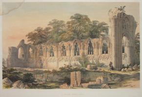 1829. Frederick Nash (age 47). View of the Ruins adjoining the South Transept of the Church [St Mary's Abbey, York [Map]], with the Palace of K. James 2nd and the Tower of the Minster in the Back Ground.".