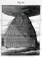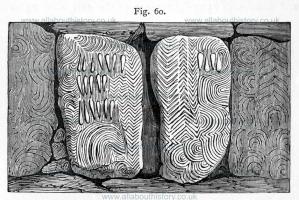 Llewellynn Jewitt 1870. Another of the more remarkable structures of the Channel Islands is that of Gavr Innis [Map], in the Morbihan, Brittany. The tumulus is about thirty feet high, and its circumference at the base about 300 feet. The cromlech is entered from the south end (fig. 55), fig. 56 being the opening on the north, and consists of 14 upright stones on the east side, 13 on the west, and 2 on the north, supporting, in all, 10 capstones. In general features it bears a strong resemblance to those at New Grange, Dowth, and other places. The remarkable feature of this chambered tumulus is that the stones composing the passage are for the most part sculptured in lines and patterns, which have been described as very similar to the patterns tattooed on their faces and bodies by the New Zealanders. Examples of these will be seen on the accompanying engravings, which exhibit some of the more marked and distinct of the patterns noticed and copied by Mr. Lukis, in his examination of this mound, and described by him in the journal of the British Archaeological Association, to the Council of which I am indebted for these illustrations.