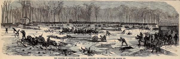 On 15th January 1867 sixty people died when the ice broke on the lake in London's Regent's Park on which around five hundred people were skating. As a consequence the lake bed which had been as deep as 3.7m, was raised to be a maximum of 1.2, Images from Harper's Weekly.
